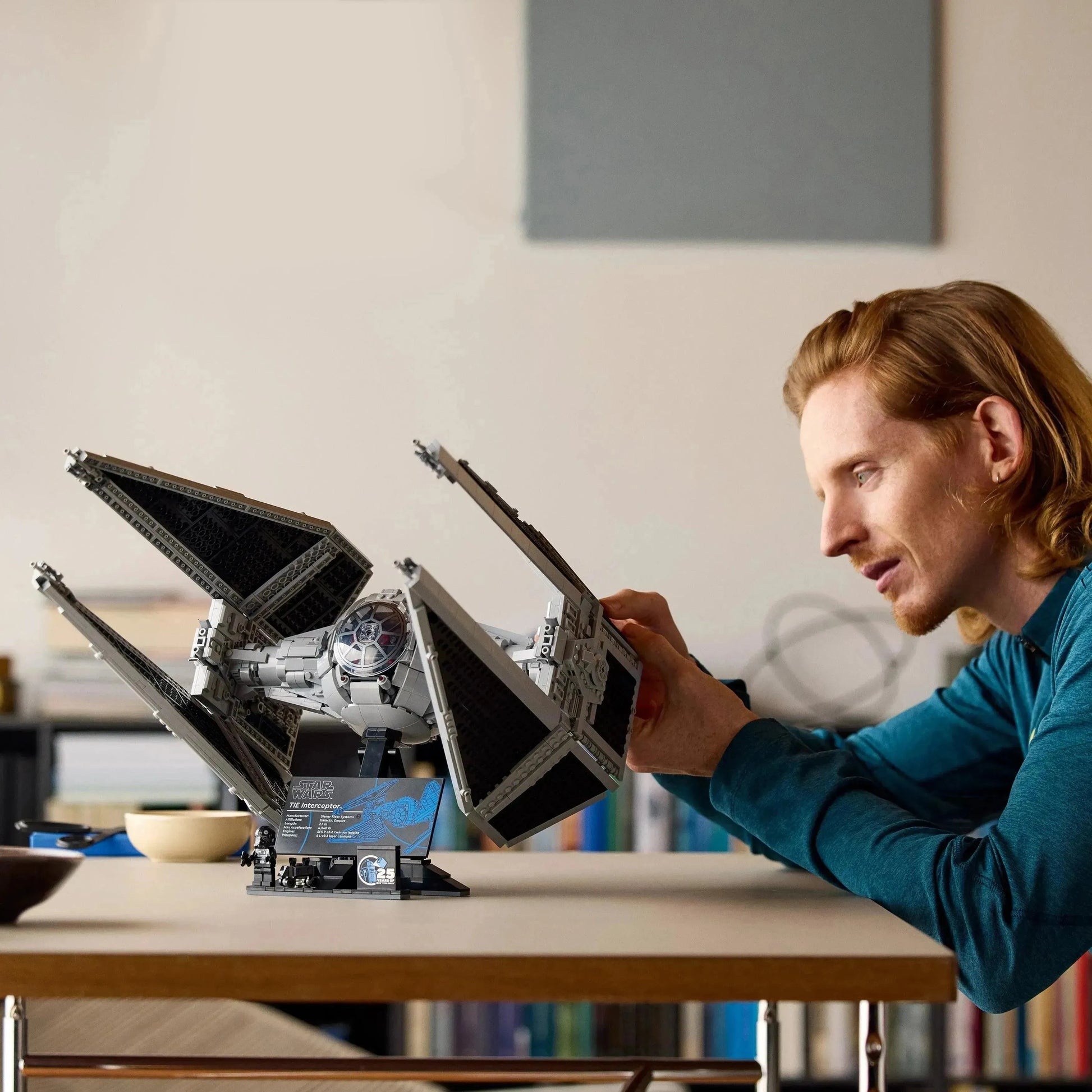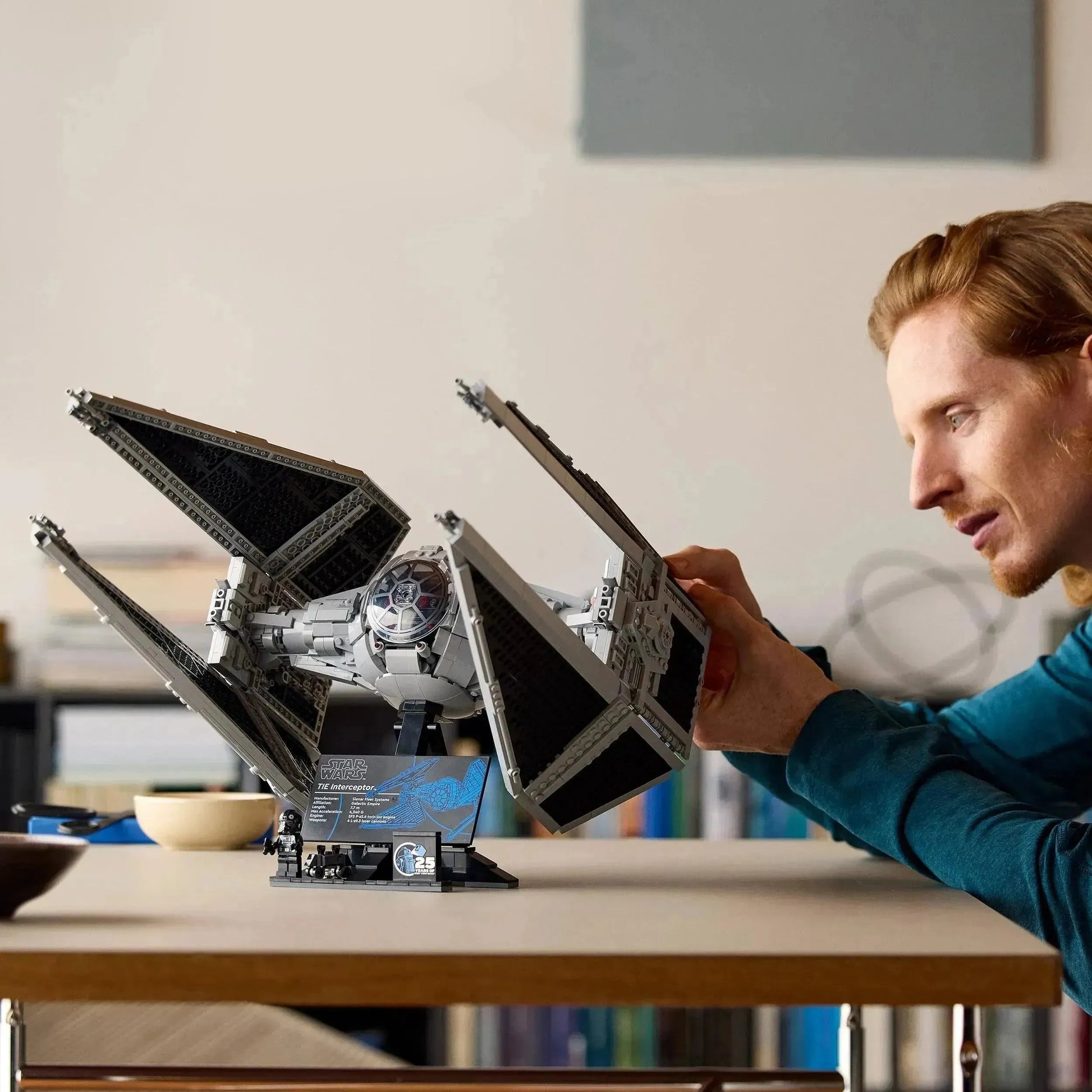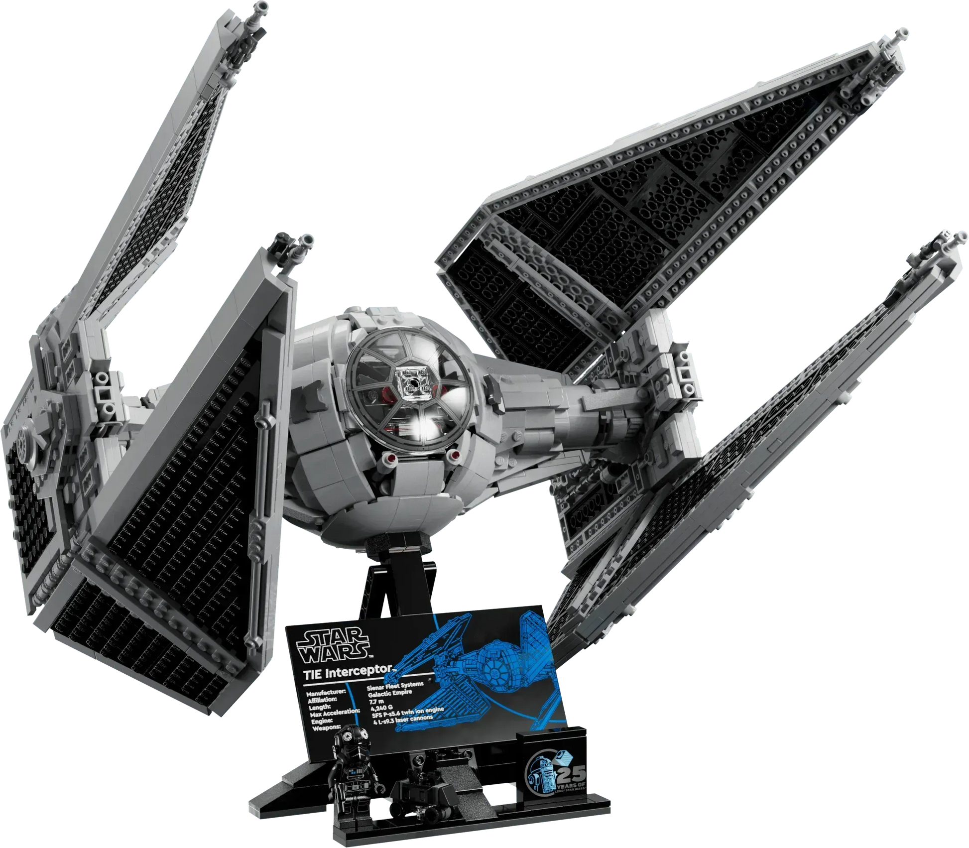 - Display model: The set is designed for display and includes a stand with an information plaque about the TIE Interceptor.